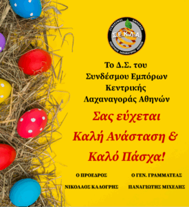 17 Απριλίου 2025 ΝΕΑ - ΔΕΛΤΙΑ ΤΥΠΟΥ Ευχές από τον ΣΕΚΛΑ Ο πρόεδρος, το ΔΣ και το προσωπικό του Συνδέσμου Εμπόρων Κεντρικής Λαχαναγοράς εύχονται σε όλους Καλό Πάσχα και Καλή Ανάσταση. Share: